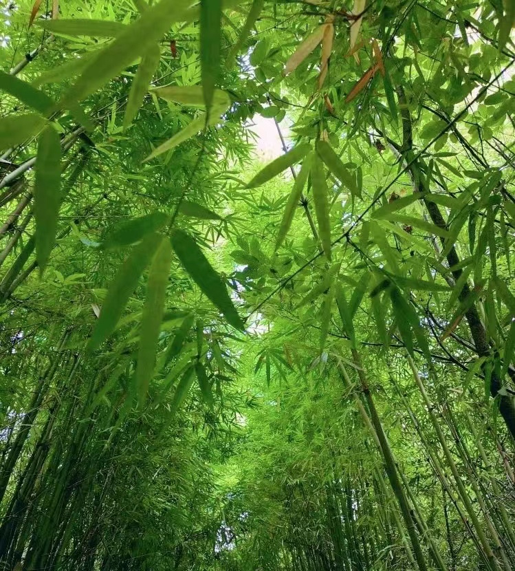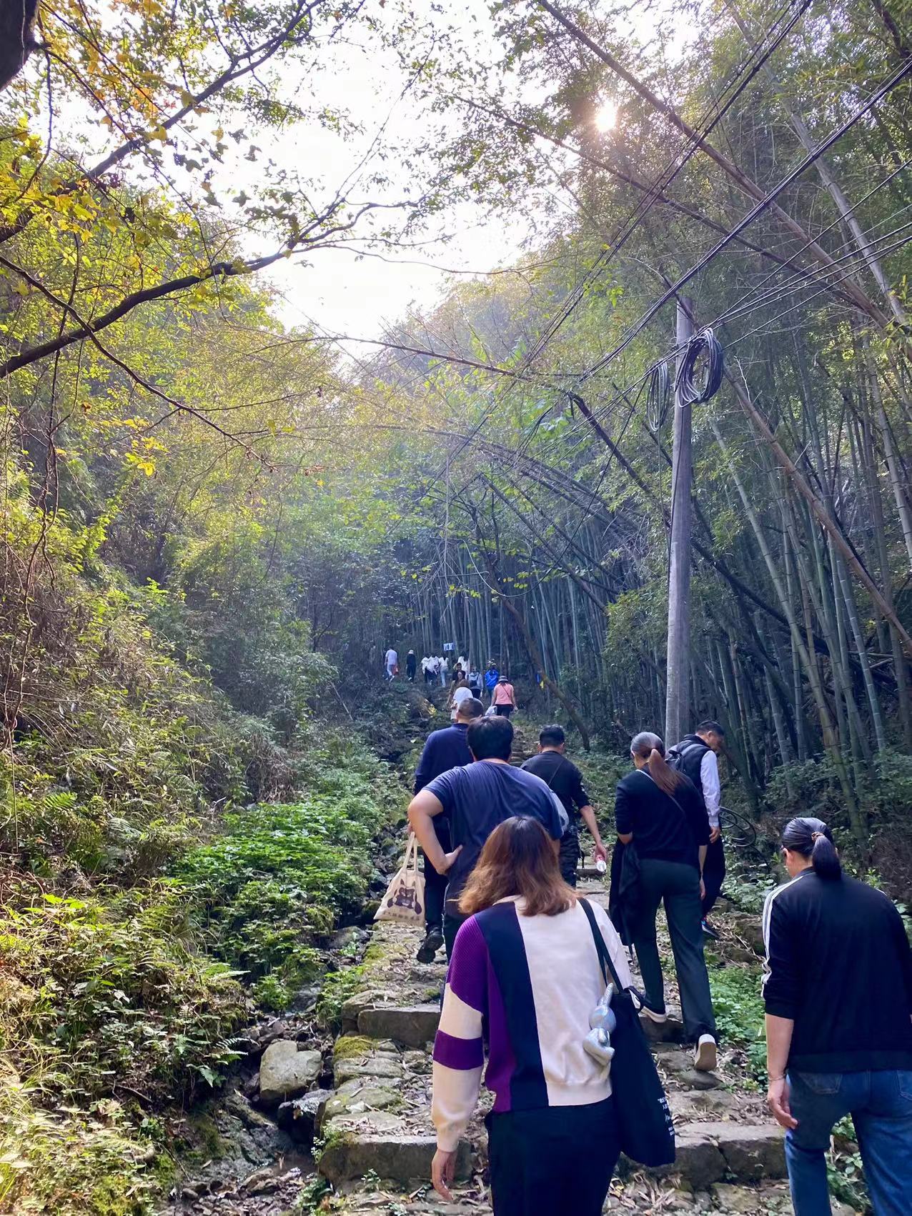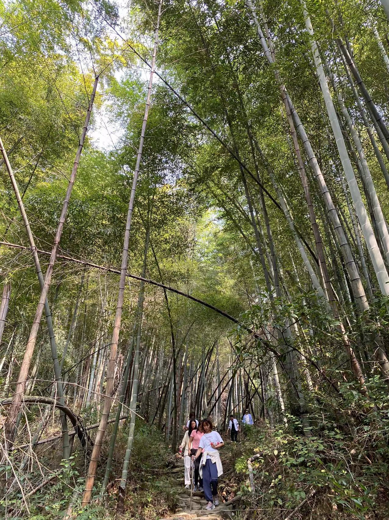 日鑄嶺古道開始時便有上坡,坡度陡峭,不知道誰從竹林里找來了半人高的竹竿,分給了體力不足的女同事,但是即使有了這把與眾不同的“登山杖”的幫助,大家來到第一個山頭的時候,還是氣喘吁吁,汗流浹背。大家互相傳遞著紙巾擦汗,不一會同事帶著的大包紙巾就見底了。抬起頭看從斑駁的樹葉里透出的陽光,恍惚間讓人覺得好像太陽變成了碎片,一片片散落在了這片竹林里。短短的長椅上,大家互相倚靠在一起,上氣不接下氣地打著趣,仿佛一大家子剛結(jié)束一天勞累農(nóng)活的佃戶,竹林里充滿了快樂的氣息,甚至大樹都笑彎了腰。