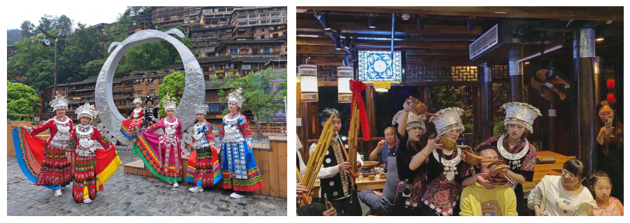 我們穿梭在小巷中,化身苗家的阿哥阿妹,一片銀鈴響過,留下歡聲笑語。喧鬧的長桌宴,高山流水的待客酒,讓我們感受到了苗家人的生活,熱辣滾燙!